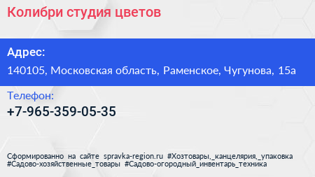 Колибри, студия цветов по адресу 140105, Московская область, Раменское, Чугунова, 15а в дальнейшем Организация, размещена в следующих категориях: