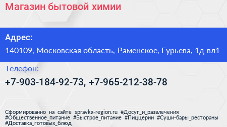 Магазин бытовой химии по адресу 140109, Московская область, Раменское, Гурьева, 1д вл1 в дальнейшем Организация, размещена в следующих категориях: