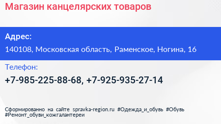 Магазин канцелярских товаров по адресу 140108, Московская область, Раменское, Ногина, 16 в дальнейшем Организация, размещена в следующих категориях: