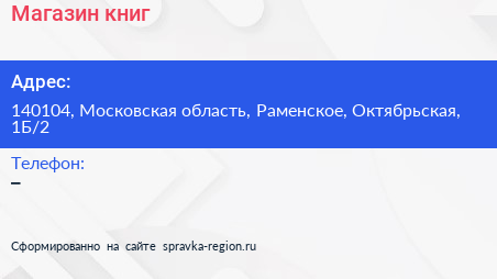 Магазин книг по адресу 140104, Московская область, Раменское, Октябрьская, 1Б/2 в дальнейшем Организация, размещена в следующих категориях: