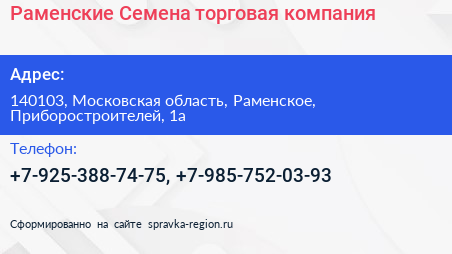 Раменские Семена, торговая компания по адресу 140103, Московская область, Раменское, Приборостроителей, 1а в дальнейшем Организация, размещена в следующих категориях: