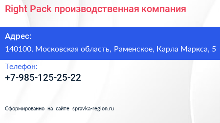 Right Pack, производственная компания по адресу 140100, Московская область, Раменское, Карла Маркса, 5 в дальнейшем Организация, размещена в следующих категориях: