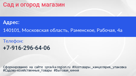 Сад и огород, магазин по адресу 140101, Московская область, Раменское, Рабочая, 4а в дальнейшем Организация, размещена в следующих категориях: