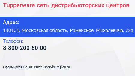 Tupperware, сеть дистрибьюторских центров по адресу 140101, Московская область, Раменское, Михалевича, 72а в дальнейшем Организация, размещена в следующих категориях: