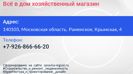 Всё в дом, хозяйственный магазин по адресу 140103, Московская область, Раменское, Крымская, 4 в дальнейшем Организация, размещена в следующих категориях:
