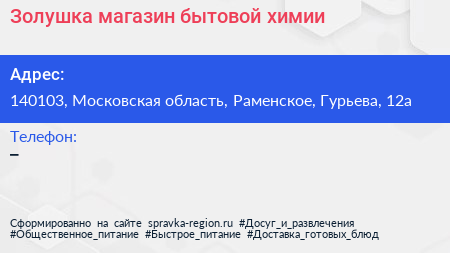 Золушка, магазин бытовой химии по адресу 140103, Московская область, Раменское, Гурьева, 12а в дальнейшем Организация, размещена в следующих категориях: