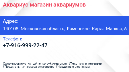 Аквариус, магазин аквариумов по адресу 140108, Московская область, Раменское, Карла Маркса, 6 в дальнейшем Организация, размещена в следующих категориях: