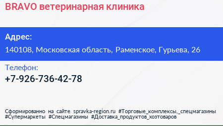 BRAVO, ветеринарная клиника по адресу 140108, Московская область, Раменское, Гурьева, 26 в дальнейшем Организация, размещена в следующих категориях: