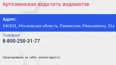 Артезианская вода, сеть водоматов по адресу 140101, Московская область, Раменское, Михалевича, 31а в дальнейшем Организация, размещена в следующих категориях: