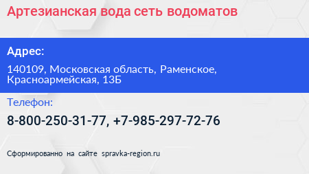 Артезианская вода, сеть водоматов по адресу 140109, Московская область, Раменское, Красноармейская, 13Б в дальнейшем Организация, размещена в следующих категориях: