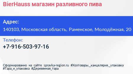 BierHauss, магазин разливного пива по адресу 140103, Московская область, Раменское, Молодёжная, 20 в дальнейшем Организация, размещена в следующих категориях: