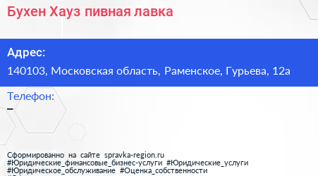 Бухен Хауз, пивная лавка по адресу 140103, Московская область, Раменское, Гурьева, 12а в дальнейшем Организация, размещена в следующих категориях: