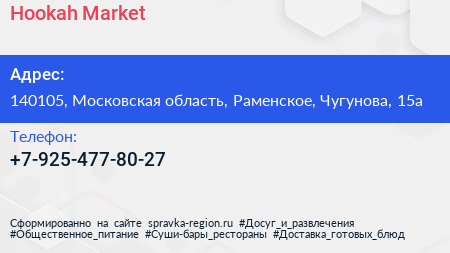 Hookah Market по адресу 140105, Московская область, Раменское, Чугунова, 15а в дальнейшем Организация, размещена в следующих категориях: