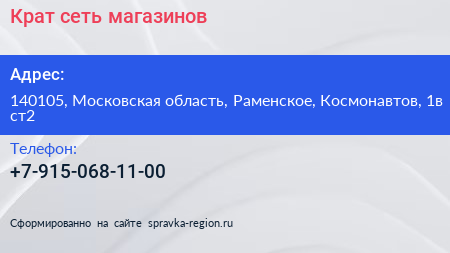 Крат, сеть магазинов по адресу 140105, Московская область, Раменское, Космонавтов, 1в ст2 в дальнейшем Организация, размещена в следующих категориях:
