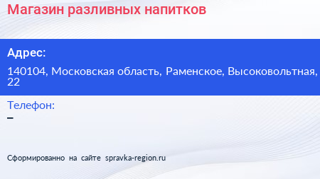 Магазин разливных напитков по адресу 140104, Московская область, Раменское, Высоковольтная, 22 в дальнейшем Организация, размещена в следующих категориях: