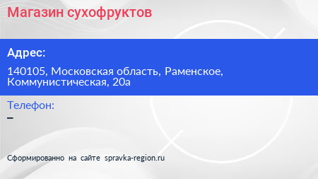 Магазин сухофруктов по адресу 140105, Московская область, Раменское, Коммунистическая, 20а в дальнейшем Организация, размещена в следующих категориях:
