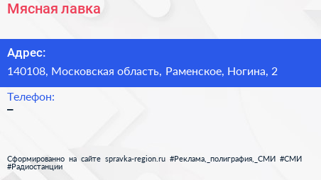 Мясная лавка по адресу 140108, Московская область, Раменское, Ногина, 2 в дальнейшем Организация, размещена в следующих категориях: