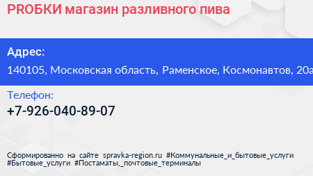 #PRОБКИ, магазин разливного пива по адресу 140105, Московская область, Раменское, Космонавтов, 20а в дальнейшем Организация, размещена в следующих категориях: