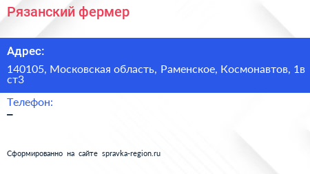 Рязанский фермер по адресу 140105, Московская область, Раменское, Космонавтов, 1в ст3 в дальнейшем Организация, размещена в следующих категориях: