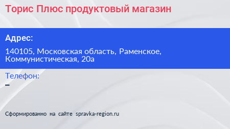 Торис Плюс, продуктовый магазин по адресу 140105, Московская область, Раменское, Коммунистическая, 20а в дальнейшем Организация, размещена в следующих категориях: