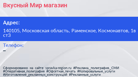 Вкусный Мир, магазин по адресу 140105, Московская область, Раменское, Космонавтов, 1в ст3 в дальнейшем Организация, размещена в следующих категориях: