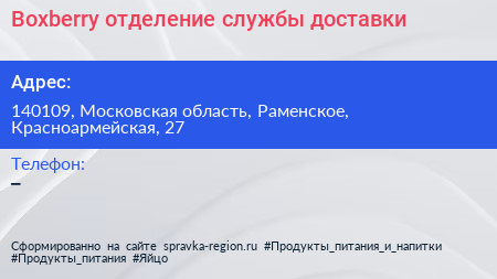 Boxberry, отделение службы доставки по адресу 140109, Московская область, Раменское, Красноармейская, 27 в дальнейшем Организация, размещена в следующих категориях:
