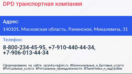 DPD, транспортная компания по адресу 140101, Московская область, Раменское, Михалевича, 31 в дальнейшем Организация, размещена в следующих категориях: