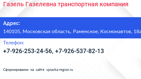 Газель Газелевна, транспортная компания по адресу 140105, Московская область, Раменское, Космонавтов, 18а в дальнейшем Организация, размещена в следующих категориях: