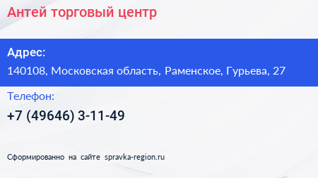 Антей, торговый центр по адресу 140108, Московская область, Раменское, Гурьева, 27 в дальнейшем Организация, размещена в следующих категориях: