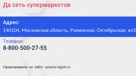 Да!, сеть супермаркетов по адресу 140104, Московская область, Раменское, Октябрьская, вл1 в дальнейшем Организация, размещена в следующих категориях: