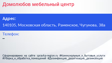 Домолюбов, мебельный центр по адресу 140105, Московская область, Раменское, Чугунова, 38а в дальнейшем Организация, размещена в следующих категориях:
