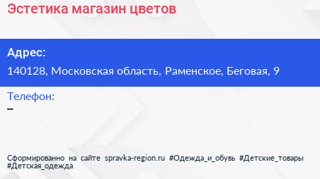 Эстетика, магазин цветов по адресу 140128, Московская область, Раменское, Беговая, 9 в дальнейшем Организация, размещена в следующих категориях: