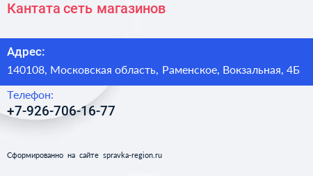 Кантата, сеть магазинов по адресу 140108, Московская область, Раменское, Вокзальная, 4Б в дальнейшем Организация, размещена в следующих категориях: