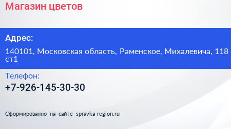 Магазин цветов по адресу 140101, Московская область, Раменское, Михалевича, 118 ст1 в дальнейшем Организация, размещена в следующих категориях: