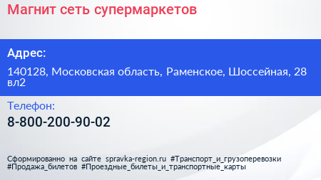 Магнит, сеть супермаркетов по адресу 140128, Московская область, Раменское, Шоссейная, 28 вл2 в дальнейшем Организация, размещена в следующих категориях: