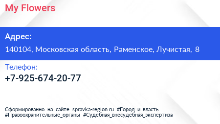 My Flowers по адресу 140104, Московская область, Раменское, Лучистая, 8 в дальнейшем Организация, размещена в следующих категориях: