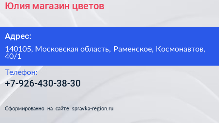 Юлия, магазин цветов по адресу 140105, Московская область, Раменское, Космонавтов, 40/1 в дальнейшем Организация, размещена в следующих категориях: