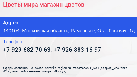 Цветы мира, магазин цветов по адресу 140104, Московская область, Раменское, Октябрьская, 1д в дальнейшем Организация, размещена в следующих категориях: