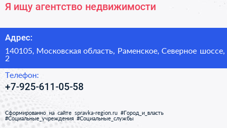 Я ищу, агентство недвижимости по адресу 140105, Московская область, Раменское, Северное шоссе, 2 в дальнейшем Организация, размещена в следующих категориях: