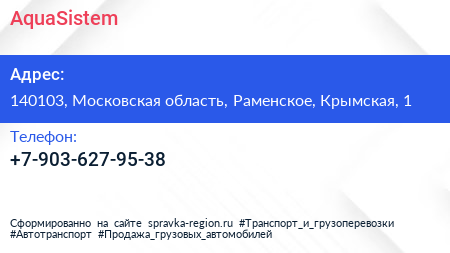 AquaSistem по адресу 140103, Московская область, Раменское, Крымская, 1 в дальнейшем Организация, размещена в следующих категориях: