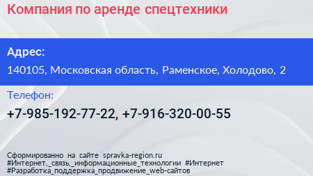 Компания по аренде спецтехники по адресу 140105, Московская область, Раменское, Холодово, 2 в дальнейшем Организация, размещена в следующих категориях: