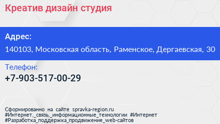 Креатив, дизайн-студия по адресу 140103, Московская область, Раменское, Дергаевская, 30 в дальнейшем Организация, размещена в следующих категориях: