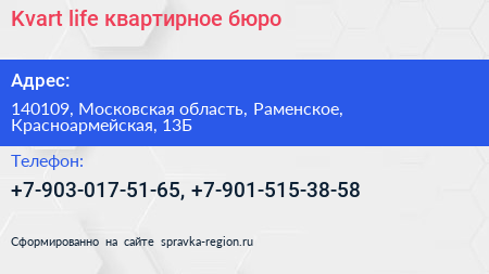 Kvart-life, квартирное бюро по адресу 140109, Московская область, Раменское, Красноармейская, 13Б в дальнейшем Организация, размещена в следующих категориях: