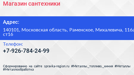 Магазин сантехники по адресу 140101, Московская область, Раменское, Михалевича, 116а ст16 в дальнейшем Организация, размещена в следующих категориях: