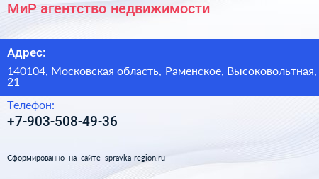 МиР, агентство недвижимости по адресу 140104, Московская область, Раменское, Высоковольтная, 21 в дальнейшем Организация, размещена в следующих категориях: