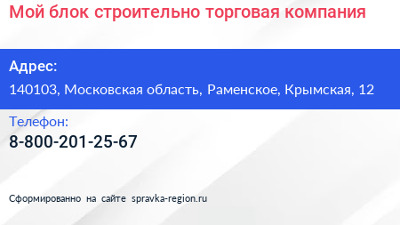 Мой блок, строительно-торговая компания по адресу 140103, Московская область, Раменское, Крымская, 12 в дальнейшем Организация, размещена в следующих категориях:
