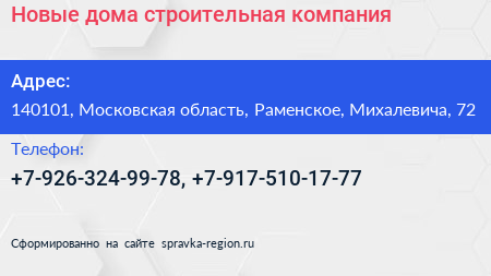 Новые дома, строительная компания по адресу 140101, Московская область, Раменское, Михалевича, 72 в дальнейшем Организация, размещена в следующих категориях: