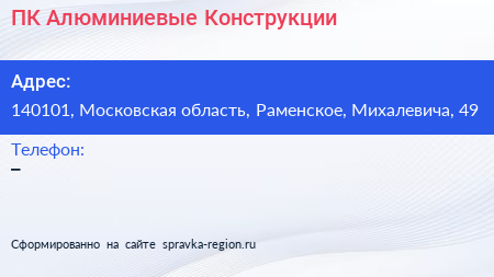 ПК Алюминиевые Конструкции по адресу 140101, Московская область, Раменское, Михалевича, 49 в дальнейшем Организация, размещена в следующих категориях:
