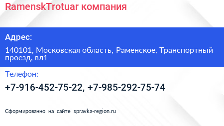 RamenskTrotuar, компания по адресу 140101, Московская область, Раменское, Транспортный проезд, вл1 в дальнейшем Организация, размещена в следующих категориях: