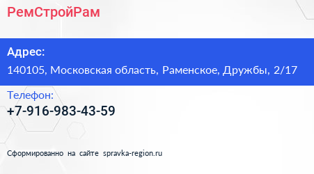 РемСтройРам по адресу 140105, Московская область, Раменское, Дружбы, 2/17 в дальнейшем Организация, размещена в следующих категориях:
